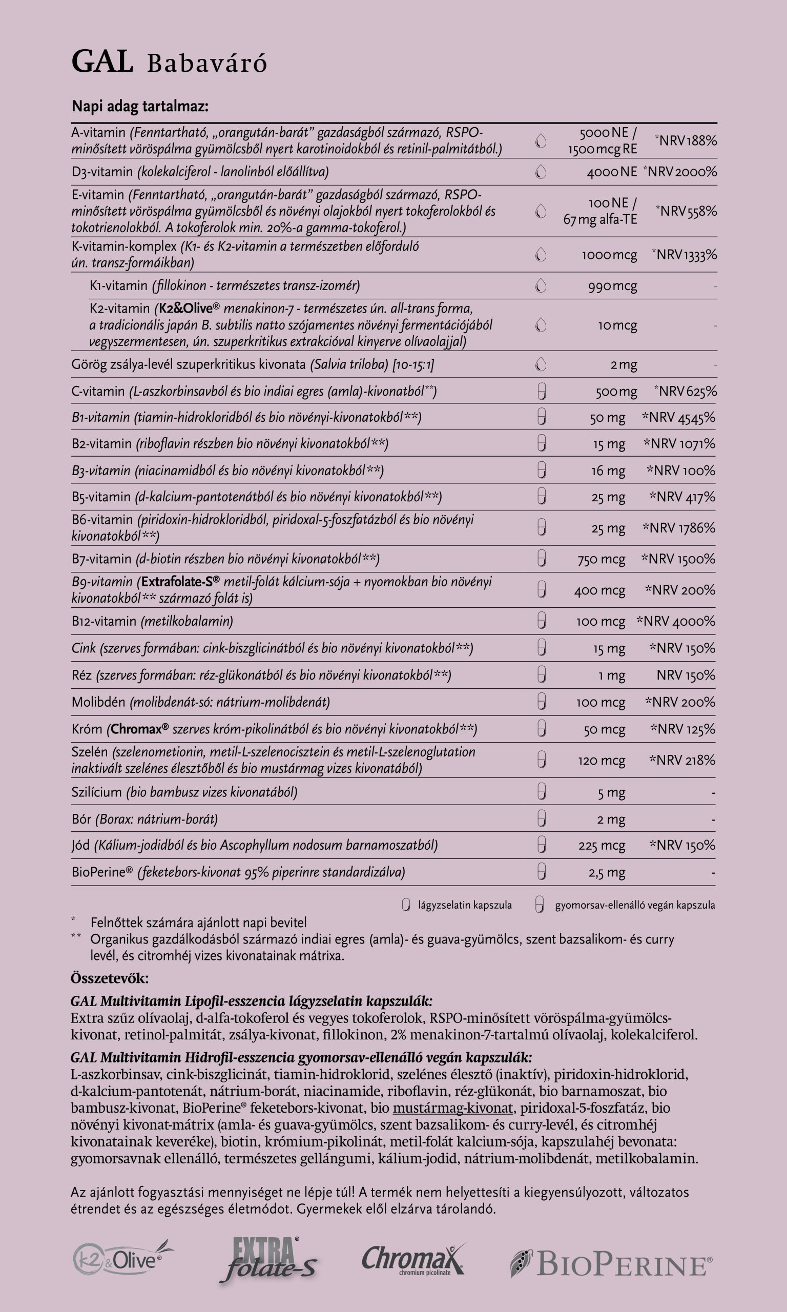 A GAL Babaváró® termékünket a legújabb kutatások fényében fejlesztettük ki, szem előtt tartva a természetességet és életszerűséget, hogy minden vitamint, ásványianyagot, nyomelemet ideális formában, mennyiségben és arányban tartalmazzon, nem eltérve attól, ahogyan ezekhez állandó tápanyagdús, változatos táplálkozással juthatnánk. Ahol előnyös, a vitaminok és ásványok részben organikus termesztésből származó (bio) gyógy- és fűszernövények kivonatából származnak. A mennyiségek esetében végig fontosnak tartottuk, hogy a napi adag biztosan tartalmazza a hatásosnak talált dózist, de semmi esetre se lépje túl az életszerű mennyiségeket, azaz azt a mennyiséget, amit táplálkozással már nem is lehetne fedezni sehogyan sem. Emellett rendkívül fontos, hogy egy új élet zavartalan fejlődését ne akadályozza semmi, ami nem odavaló. A termékünkben ilyesminek nyomát sem találja.